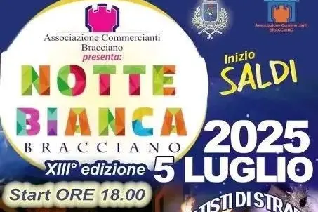 Grande attesa per la Notte Bianca a Bracciano: sabato 5 luglio il centro storico sarà animato da musica e divertimento, grazie all' Associazione Commercianti e il comune di Bracciano. Una tradizione che si rinnova, un appuntamento che sabato vedrà per le vie di Bracciano esibirsi artisti di strada, con mercatini dell'artigianato e tanti spazi riservati al food. Negozi aperti e strade colorate a festa per una Notte Bianca che si annuncia elettrizzante.