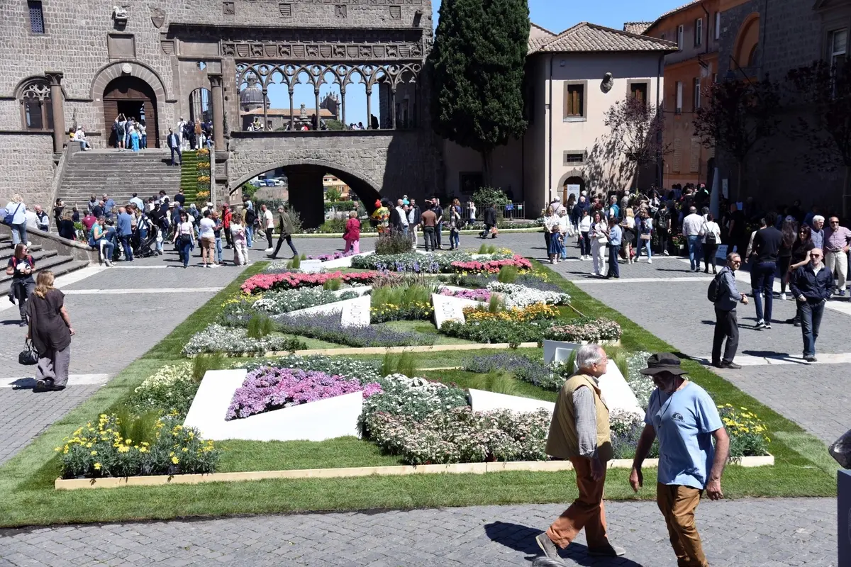 Preceduto poi dal suono delle chiarine e dei tamburi e dai figuranti del gruppo La Contesa, l’architetto Porciani ha guidato il folto corteo di intervenuti alla cerimonia in un tour alla scoperta degli allestimenti nelle varie piazze, illustrando dettagli e fornendo spiegazioni tra un tripudio florovivaistico e di specchi - filo conduttore del progetto ideato da Porciani - che riecheggiano l'idea di laghi e stagni tipici del territorio viterbese. Una passeggiata “guidata” con momenti di slalom tra la folla di visitatori e turisti che fin dal mattino ha gremito il quartiere medievale per ammirare le installazioni ma anche attratta dai mercatini di fiori e piante. Un’edizione che, oltre all’anno giubilare in corso, ha reso omaggio anche a papa Francesco, scomparso il lunedì di Pasqua, con parole estratte dalla sua enciclica sul Creato. San Pellegrino in fiore si conferma anche in questo 2025 come la grande festa che dà il benvenuto alla stagione primavera-estate a Viterbo.