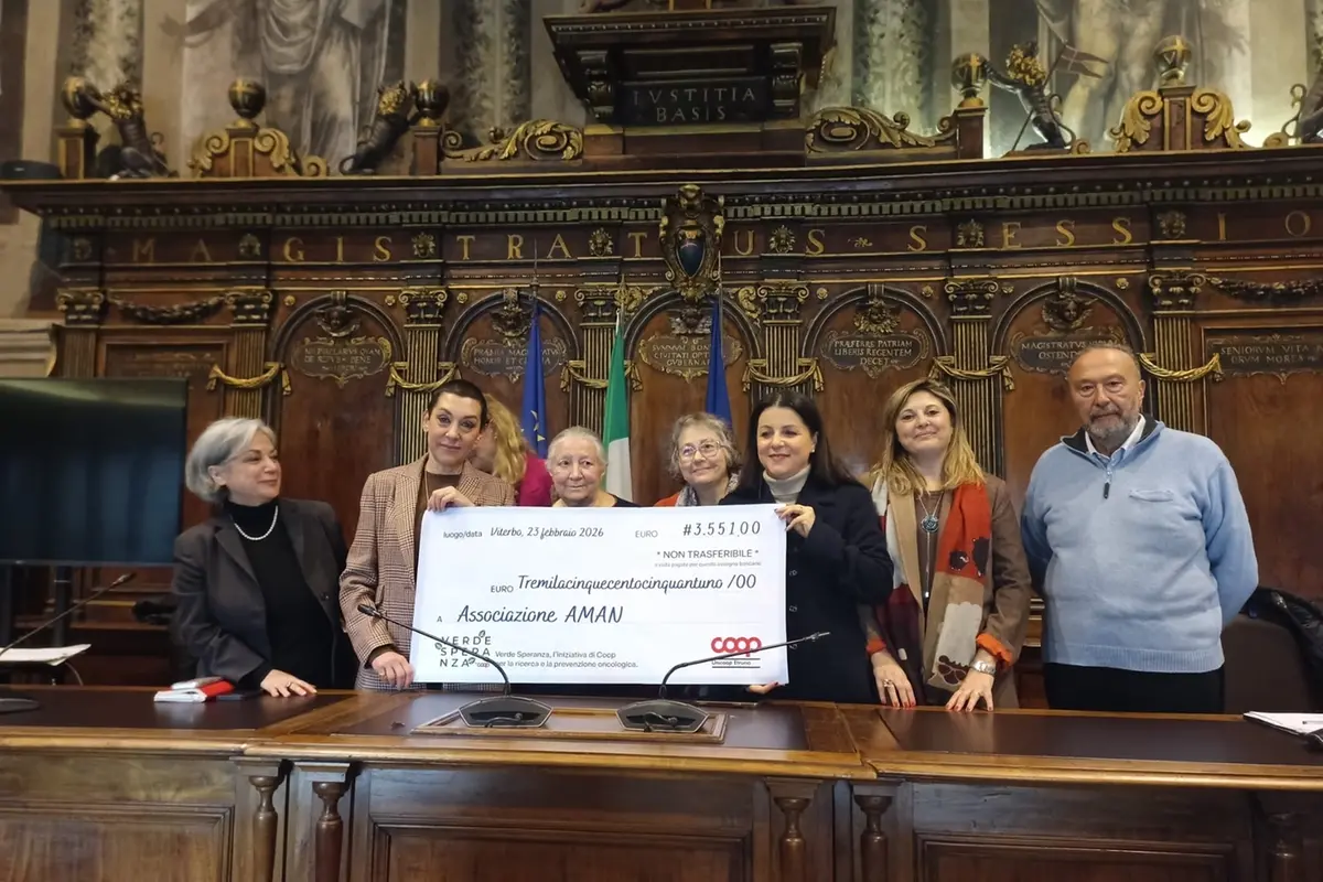 «Il mondo del commercio sposa l'etica e la solidarietà». A sottolineare il connubio Simonetta Radi, presidente del Consiglio di sorveglianza di Unicoop Etruria, durante la consegna della raccolta fondi dell'iniziativa Verde Speranza organizzata dalla cooperativa a favore dell’Aman. «Essere nella sala d'Ercole per Unicoop significa essere al centro della comunità» ha proseguito per poi specificare la somma raccolta tramite la vendita delle piantine: 3.551 euro. Ieri, alla presenza della sindaca Chiara Frontini, dell'assessore alle Politiche sociali Rosanna Giliberto, della presidente Aman Maria Neve, della dottoressa Francesca Primi del reparto di Oncologia dell’ospedale Santa Rosa e del vicepresidente Aman e consigliere comunale Umberto Di Fusco, la consegna simbolica dell’assegno mentre la somma è già a disposizione dell'associazione che opera per il miglioramento dell’assistenza e cura dei malati neoplastici. Sottolineando come «il Terzo settore sia spina dorsale irrinunciabile a supporto dell’attività del Comune», la prima cittadina ha tenuto a evidenziare che «il fare squadra tra istituzioni, commercio e terzo settore rappresenta la sostanza di una città che sostiene e si coalizza a favore di persone che vivono momenti di fragilità». Questa volta Aman, come spiegato dalla presidente Neve, ha scelto un percorso diverso per quanto riguarda la destinazione dei fondi «solitamente impiegati per il day hospital e l'acquisto di attrezzature per il reparto di oncologia». Una diversa destinazione illustrata da Francesca Primi, dottoressa del reparto Oncologia del nosocomio viterbese. «L’attività clinica presenta varie sfaccettature, oltre alla dotazione di beni durevoli. Ho quindi chiesto stavolta ad Aman una sovvenzione per un corso di emergenza che permetta la formazione, aumentandone le competenze, di tutti gli operatori medici e di una parte selezionata di infermieri. Perché sono diversi gli aspetti di cura da tenere in considerazione per migliorare l'assistenza ai malati oncologici» ha spiegato.