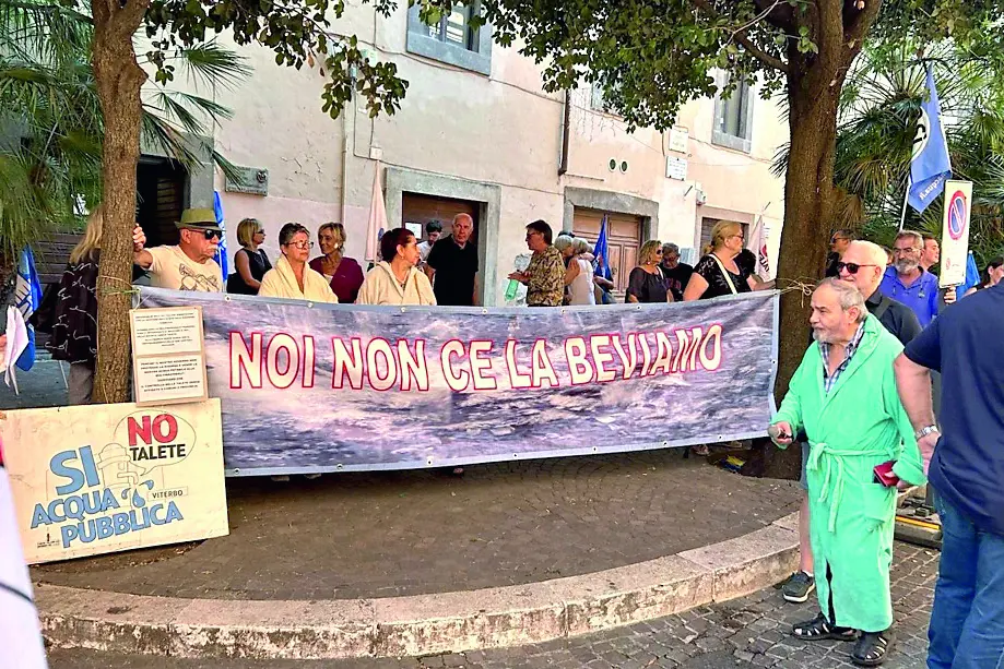 Rubinetti a secco da una parte, dall'altra acqua contaminata da arsenico e altri patogeni e in più pagata a carissimo prezzo. È la fotografia della situazione idrica nella provincia di Viterbo, su cui incombe inoltre la cessione del 40% delle quote societarie di Talete ai privati, scattata da Non ce la beviamo che, insieme ad altri comitati per l’acqua pubblica e ai consiglieri comunali di Vallerano, Civita Castellana e Tuscania, ha manifestato ieri davanti alla sede della Provincia con indosso degli accappatoi. Paola Celletti ha rinnovato l'appello a tutti i sindaci del Viterbese “a non cedere la nostra acqua ai privati. Noi abbiamo chiesto più volte di essere ascoltati ma abbiamo sempre trovato il portone chiuso”.