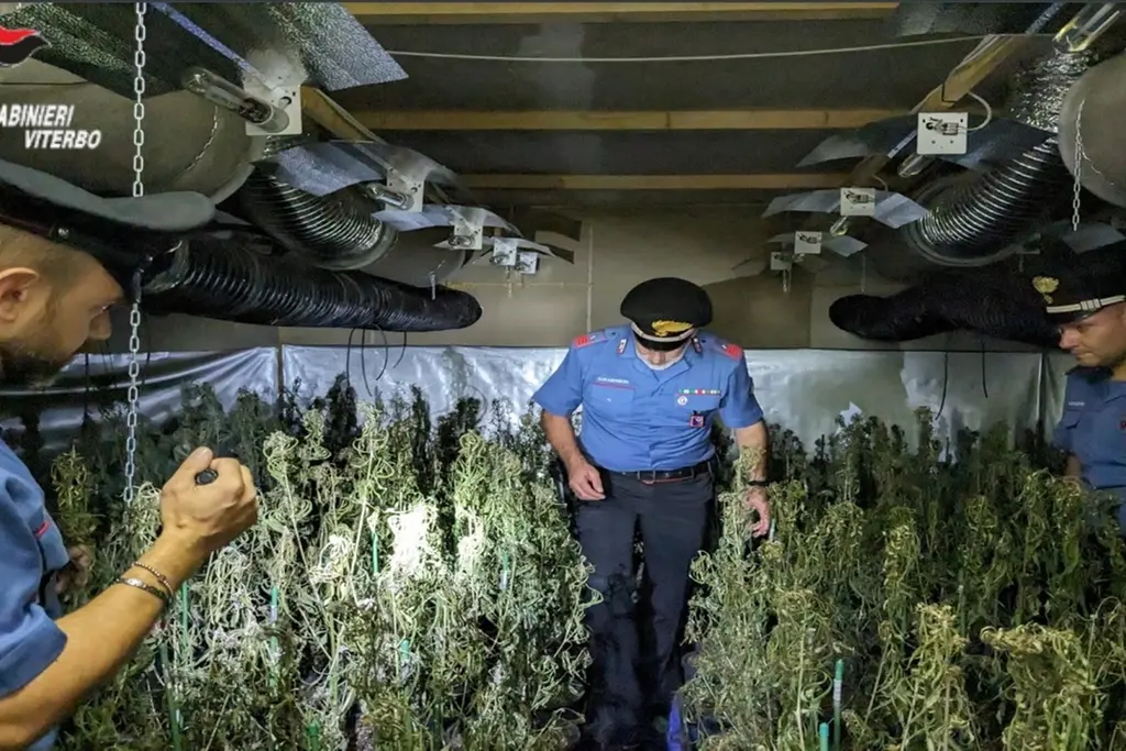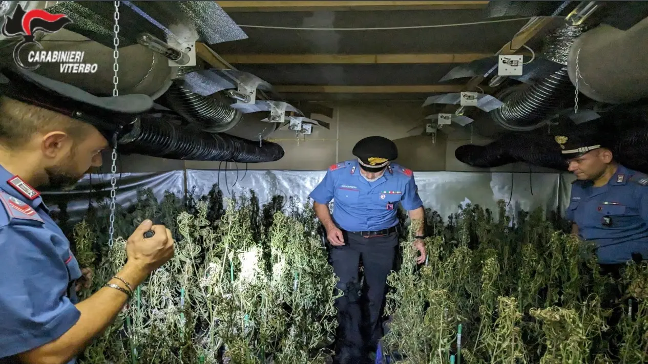 I carabinieri hanno sequestrato due chili di marijuana e 2.200 piante all'interno di un capannone di circa 550 metri quadrati nelle campagne di Civita Castellana.