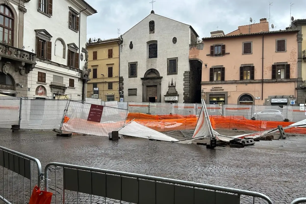 Il vento ha scaraventato a terra anche le transenne che delimitano il cantiere per la pavimentazione della piazza.