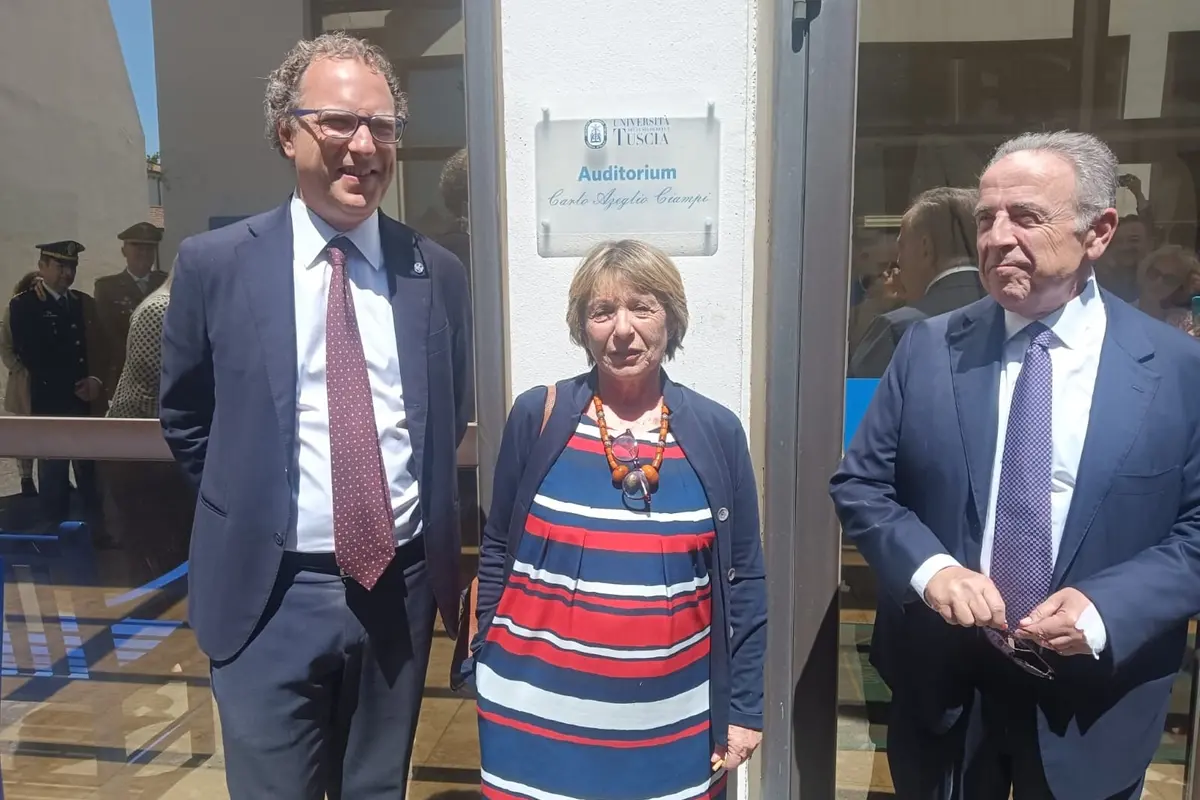 Il rettore ha detto che «quello di oggi è un giorno che unisce la memoria. L’intitolazione dell’auditorium al presidente Ciampi, persona dallo stile sobrio e dedito al bene comune, non è solo un atto formale ma che deriva dall’interesse di Ciampi per la cultura e la ricerca. Ciampi in molte occasioni ha ribadito che senza cittadini liberi e responsabili non c’è futuro: per questo è insostituibile il ruolo dei saperi. In un celebre discorso del 2002 Ciampi disse ai giovani studenti l’Università è luogo di passione e responsabilità: queste parole ci indicano la direzione per il futuro». Ubertini ha poi ricordato che «il 14 settembre 1999 Ciampi venne all’Unitus. L’intitolazione avviene in un momento particolare per Unitus che, ora, ha collaborazioni internazionali». Su sua figlia, Ubertini ha detto che «abbiamo profonda riconoscenza verso Gabriella che ha insegnato per anni qui e ha incarnato i valori più profondi come il rispetto delle istituzioni e la sobrietà come punto di forza. Era un appassionato di musica Carlo Azeglio Ciampi - ha concluso il rettore – e intitolare l’auditorium al suo nome significa collegarlo a un nostro simbolo vero per quello che ha saputo trasmettere: senso dell’onore e della misura che devono tornare a essere il nostro codice genetico». Gabriella Ciampi, che ha tenuto l’ultimo discorso e scoperto la targa, ha raccontato che «c’era una regola in casa: leggi i giornali e cerca di capire e che ognuno deve rispettare i propri ambiti. Siamo stati educati a un profondo rispetto della privacy. A Viterbo sono stata molto bene perché qui ero io, me stessa».
