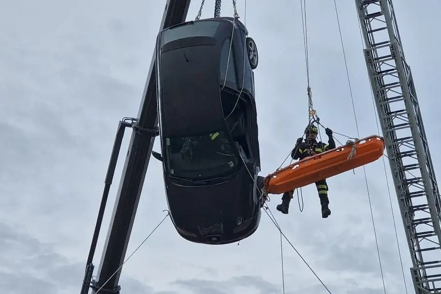 In seguito i colleghi del nucleo-speleo-alpino-fluviale, si sono esibiti in uno spettacolare salvataggio in quota calandosi da un cestello estensibile ed estraendo un manichino da addestramento, da una vettura sospesa a 20 metri di altezza.