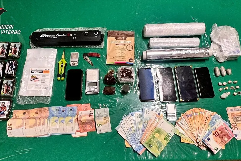 Le ulteriori indagini, hanno portato ad estendere le perquisizioni nei confronti di una coppia di Viterbo, rinvenendo e sequestrando circa 40 grammi di eroina in dosi, hashish, cocaina, strumenti il confezionamento, altro denaro contante e due banconote false da 50 euro.