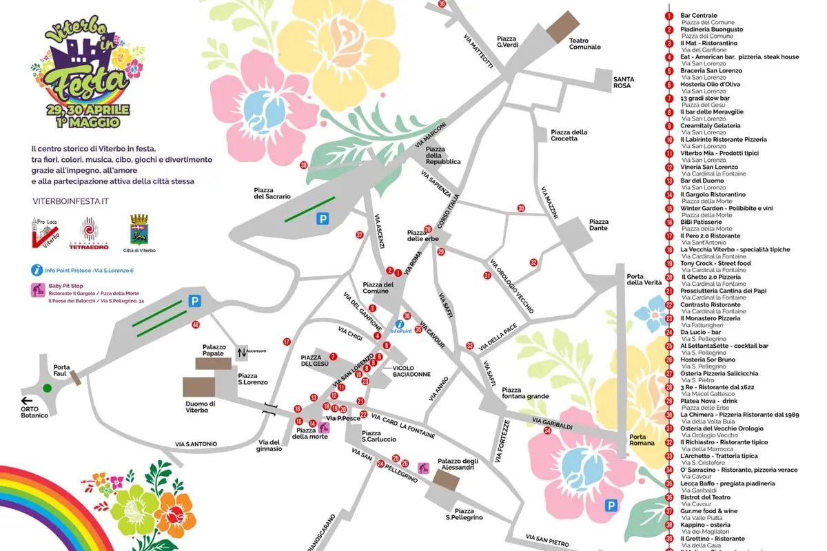 Ecco allora come la Pro loco spiega come è nato l’evento e chi fa cosa: “Viterbo in festa è un evento creato dalla città. Spontaneamente. Noi insieme al Tetraedro Compagnia Teatrale avevamo pensato di organizzare San Pellegrino in Festa, per il ponte del 2 giugno. Quando l’assessore Silvio Franco ha annunciato che il Comune non avrebbe organizzato San Pellegrino in Fiore - prosegue la Pro loco - abbiamo proposto di farlo in quel week end, visto che è uno dei ponti turisticamente più pieni dell’anno ed una data in cui tradizionalmente i turisti ( e i viterbesi) si aspettano di trovare un evento. Quindi abbiamo virato su quella data. A quel punto siamo stati chiamati da altre parti del centro storico. E allora ci è sembrato più giusto chiamarla Viterbo in Festa. Nessuno ha escluso nessuno». La Pro loco rimarca che «nessuno aveva né ha mai pensato di organizzare una manifestazione in tutto il centro storico. Ci sono vie e piazze che hanno aderito in toto, altre a cui non è interessato partecipare. Libera scelta. C’è chi ha voluto esserci. Senza obblighi, spontaneamente, proponendo un’idea, un evento, un allestimento».