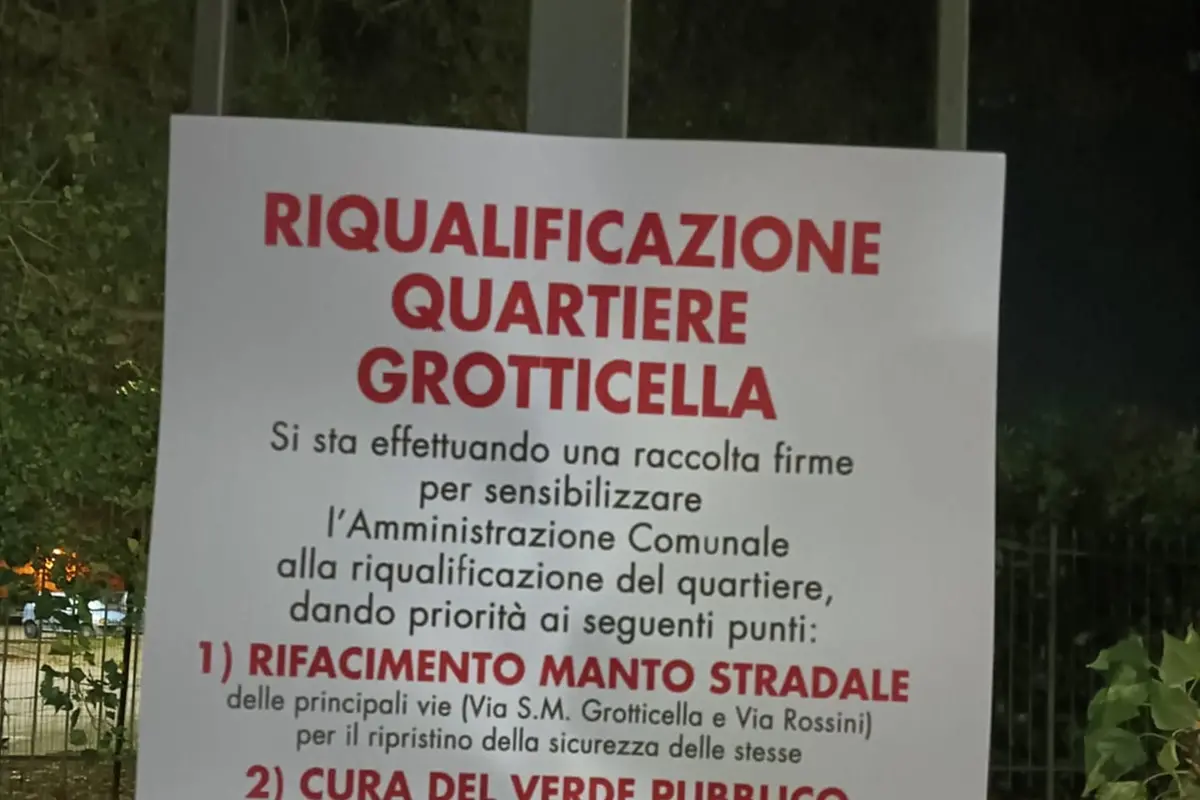 «Si sta effettuando una raccolta firme – si legge sul cartello apparso nelle scorse ore nella zona della Grotticella – per sensibilizzare l’amministrazione comunale alla riqualificazione del quartiere dando priorità ai seguenti punti: 1) rifacimento del manto stradale delle principali vie (via S.M. Grotticella e via Rossini) per il ripristino della sicurezza delle stesse; 2) Cura del verde pubblico. Residenti e lavoratori del quartiere potranno apporre la loro firma sulle schede che troveranno presso le attività commerciali in via S.M. della Grotticella e via Rossini. Le schede firmate saranno fatte pervenire alla sindaca di Viterbo».