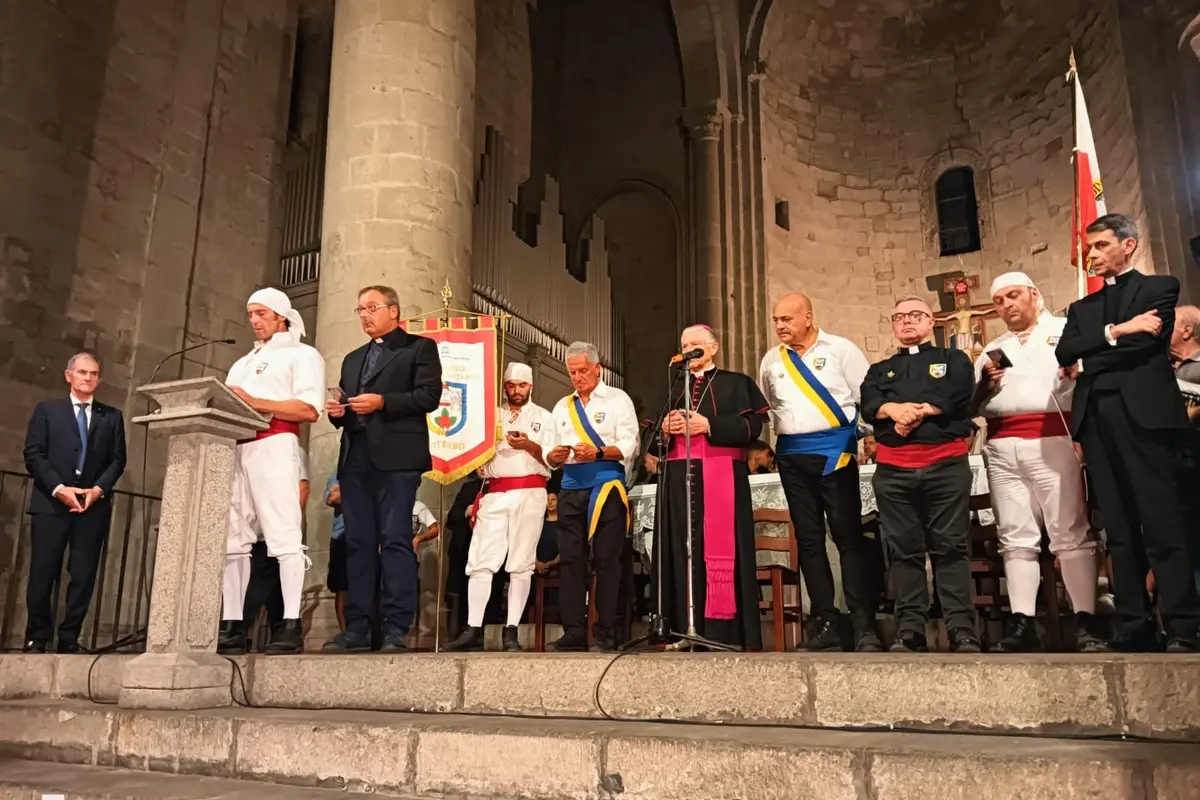 «Siate testimoni del cuore di Santa Rosa». Lo ha detto il vescovo Orazio Francesco Piazza ai facchini nella benedizione nella chiesa di San Sisto. «Chiedo per voi tutta l'energia che ho avuto modo di vedere in questi mesi». Il Trasporto della Macchina di Santa Rosa è al via. Qualche minuto ancora e arriverà il “Sollevate e fermi”, l’ordine del capofacchino, Sandro Rossi che dà il via alla processione.